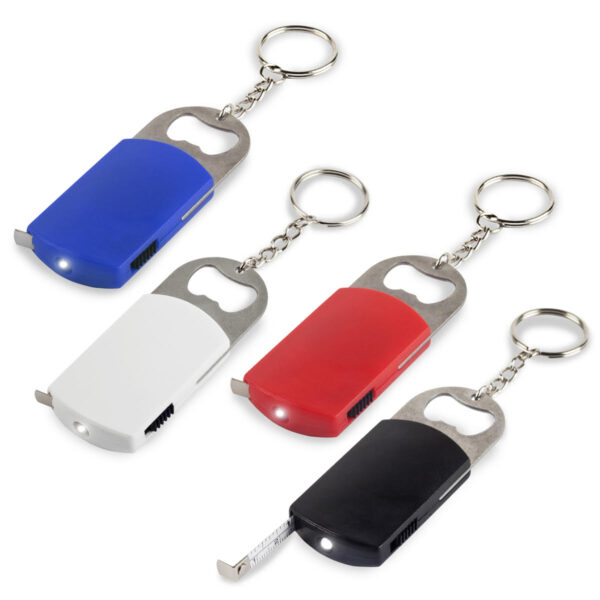 מחזיק מפתחות ממתכת איכותית כולל פותחן, פנס ומטר רץ