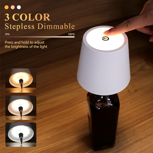 מנורה מעוצבת נטענת עם פקק לסגירת בקבוקים ו- 3 מצבי תאורה: קרה, חמה ומעורבת.
