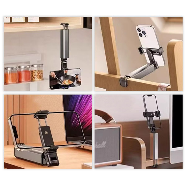 מעמד טלפון רב שימושי מתאים לכל משטח ועשוי ממתכת.