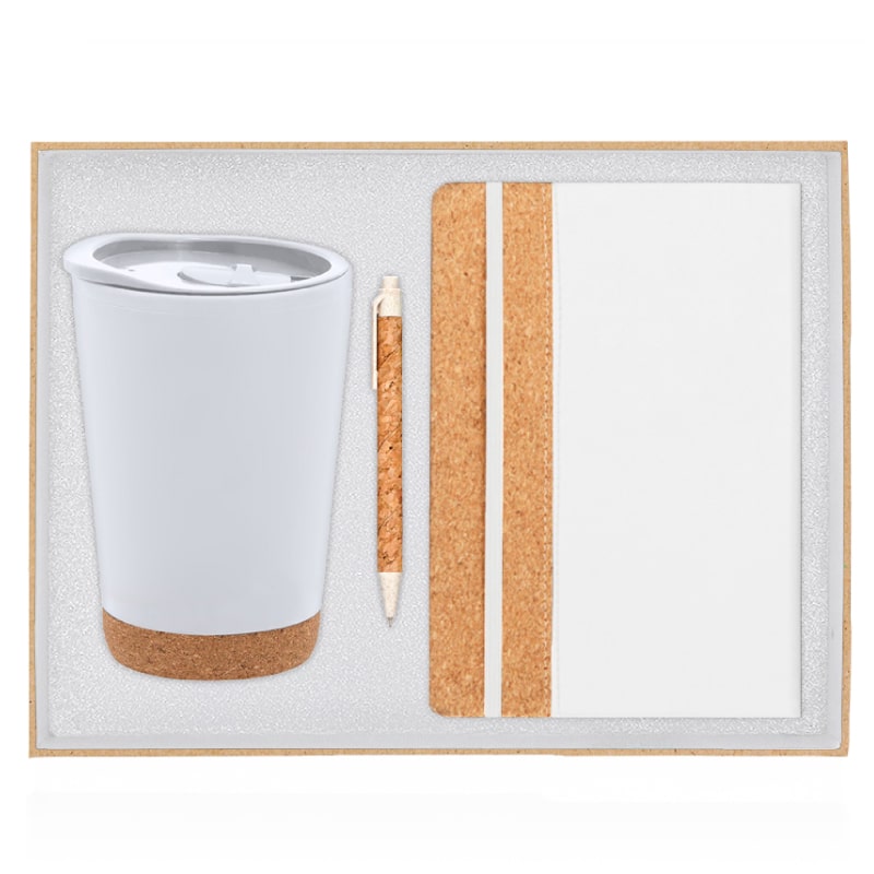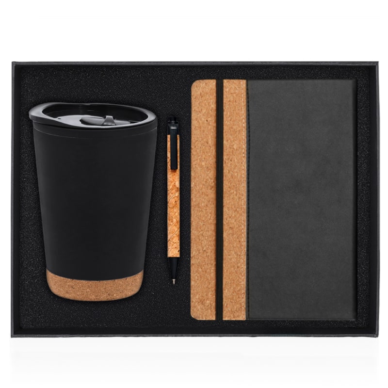 הסט כולל: מחברת A5, ספל תרמי ועט ג'ל.