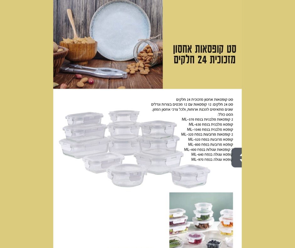 סט קופסאות אחסון מזכוכית לאחסון והגשה 24 חלקים בצורות וגדלים שונים.